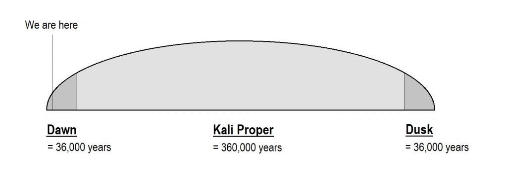 One day of Brahma mentioned in the above quote is 4.32 billion human years. Flying through this day of Brahma that we are currently in, we find ourselves in the dawn of an Iron Age which began around 5100 years ago – as per the diagram – and coincided with the Noah’s Ark Flood of the Bible. In this dark and dull age, people only have one quarter of their good qualities. Spiritual efforts decline, negativity predominates. Selfishness, anger, jealousy, pride, greed, lust, strife, fear, hunger and despair gain ground – and we certainly see evidence of this all around us.